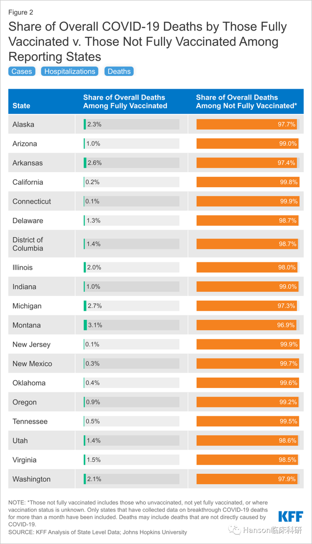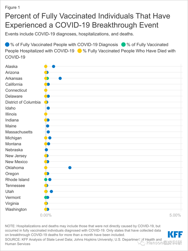 我们搜到的材料来自于KFF,他们汇总了美国所有报告突破性病例情况,美国一半的州(25个州)报告了COVID-19突破性感染事件,其中19个州提供了住院和病死的数据。