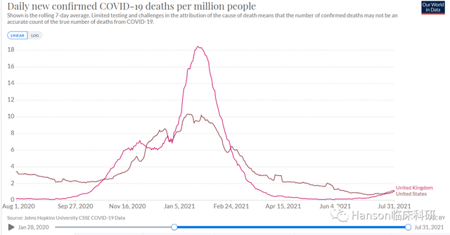 下图展示了英国和美国目前的病死率,即使在感染者以未完全接种疫苗者为主,两国因为新冠病毒感染的病死人数并没有大量增加。