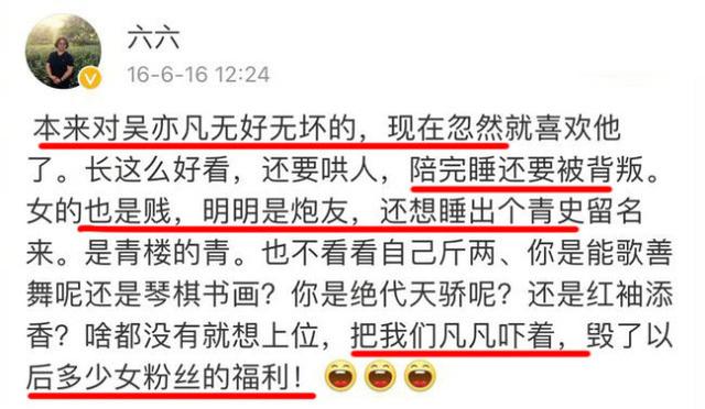 近日,吴亦凡因涉嫌强奸罪被刑拘,他的各平台账号也被封禁了,他不仅资产被冻结,5千多万粉丝一夜间也化为了乌有。2016年,在小G娜爆料吴亦凡丑闻后,力挺吴亦凡的“六六”“马薇薇”,虽然在吴亦凡被抓后,公开道了歉,但是也被封禁了账号。苏芒也被禁言了。互联网是有记忆的,不是所有的事情简单的道歉就会被原谅了的。