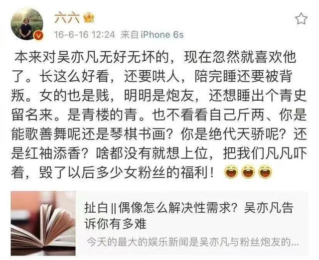 2016年,编剧六六在另一个姑娘揭露吴亦凡的时候写过这样的话。