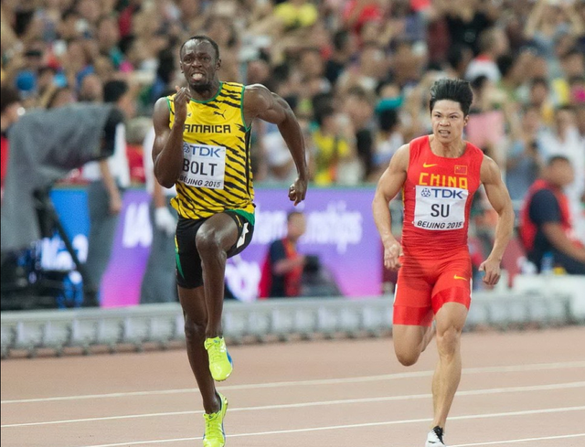 再次,他个子还矮。苏炳添的身高是一米七二。博尔特的身高是一米九六。跑步这项目虽然还不能说是一寸长一寸强,但是腿长肯定占优势啊。