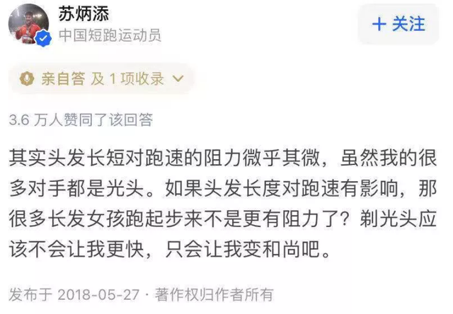 总之,剃头是不可能剃头的,往大了说,苏神如果剃了头发,只怕今后所有的中国短跑运动员都要剃成个秃瓢了。往小了说,苏神剃了头发,回去就没法跟媳妇儿交代了。当然最根本的原因还是:剃头就不!帅!了!