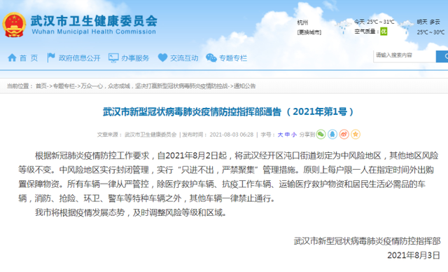 武汉市新型冠状病毒肺炎疫情防控指挥部8月3日清晨发布通告宣布,自2021年8月2日起,将武汉经开区沌口街道划定为中风险地区,其他地区风险等级不变。