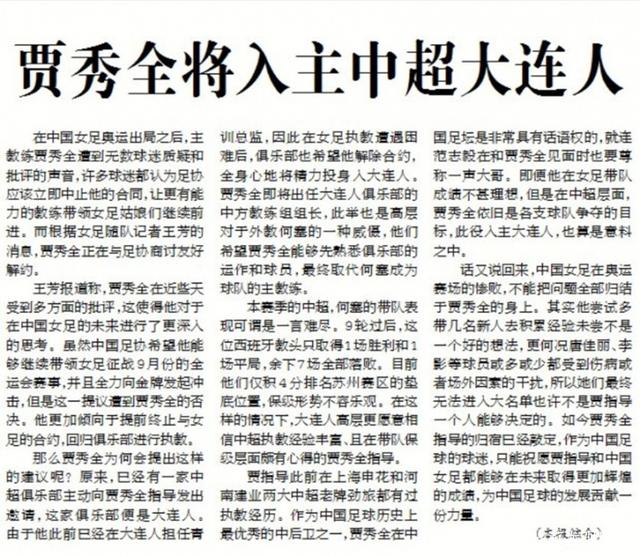 8月3日,有一个中国足坛传来一个重磅消息,据 《延边日报》消息,中国女足主帅贾秀全将出任大连人俱乐部的中方教练组组长。女足奥运出局,贾秀全备受质疑,帅位难保。女足随队记者王芳透露,贾秀全正在与足协友好商讨解约。贾秀全提出这样的建议呢,是因为收到一家中超俱乐部的主动邀请,该俱乐部就是大连人。