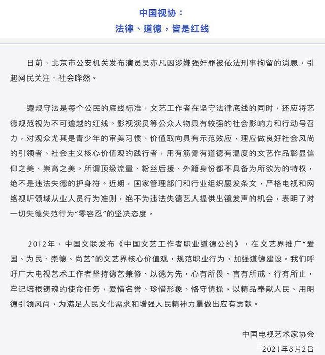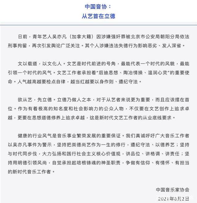音协:从艺首在立德。