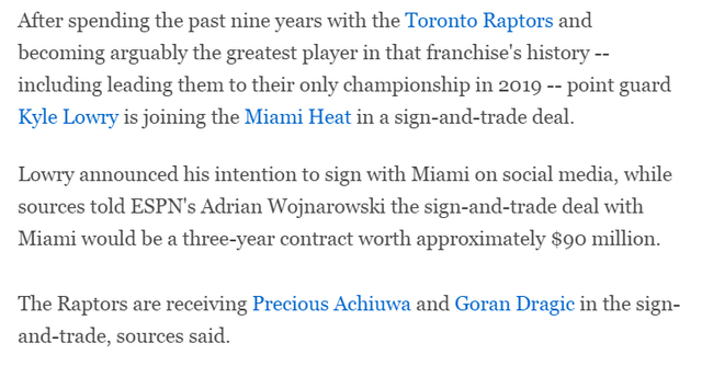 根据The Athletic知名记者Shams Charania的报道,自由球员凯尔·洛瑞已经通过先签后换的方式确定加盟热火,并且将与热火队签下一份3年价值9000万美元的合同,随后洛瑞本人也在社媒上晒出了相关内容,确认了这一消息。