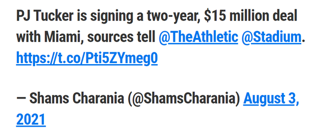 根据Shams的报道,自由球员PJ·塔克没有与雄鹿队完成续约,而是以一份2年价值1500万美元的合同,最终选择签约热火!