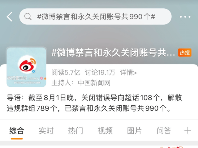 截至8月1日晚,微博关闭错误导向超话108个,解散违规群组789个,禁言和永久关闭账号共990个。