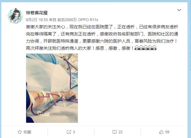 网友8月2日傍晚发布微博称,自己已到院接受透析。微博@帘卷黄花瘦 截图8月2日18时55分,用户“帘卷黄花瘦”发布微博称,自己已经在医院里接受透析,另有其他病友完成透析,在等待隔离。“感谢政府各级职能部门、医院和社区的通力协调,开辟就医特殊通道,更要感激六院的医护人员,冒着风险为我们治疗!”郑州市第六人民医院发布的前述说明称,他们向因此次疫情无法在该院进行透析治疗的患者以及其他正常治疗受到影响的患者表示诚挚歉意。7月31日,该院因疫情防控所需开始闭环管理,停止诊疗活动,但患者的需求始终是他们最关心最关注的。针对患者反映情况,经研究,决定分批次分轻重开展患者的透析治疗,8月2日当天,已有60名原在治患者接受了透析治疗。