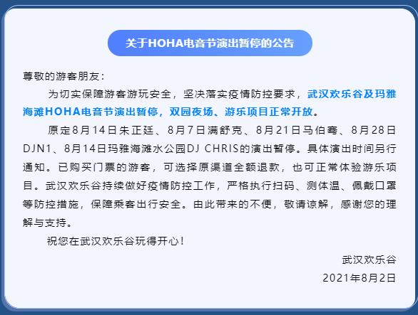 武汉欢乐谷微信公众号8月2日发布通知截图。