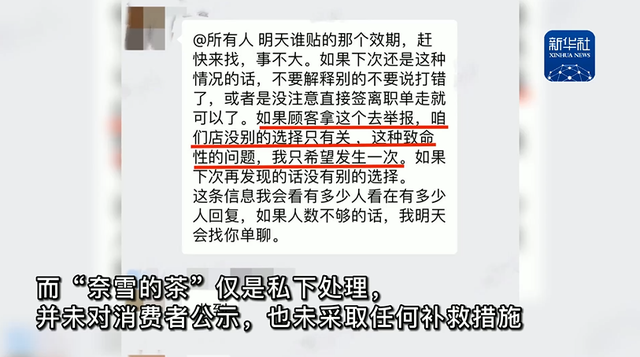 奈雪饮品“霸气柠檬油柑”保质期只有一天。但在“奈雪的茶”北京西单大悦城店,生产标签为手工输入。因操作失误,出现过工作人员错将当天该品生产日期打成前一天的情况。直到晚上闭店时,店长才发现。工作人员在群中私下处理了此事,相关情况并未对消费者公示,也未采取任何补救措施。