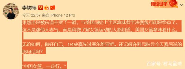 无独有偶,当抽签结果出炉后,另一名著名篮球记者李轶楠也在个人社交媒体上写道:“果然还是被东道主摆了一道,与美国同处上半区意味着半决赛很可能是终点了。这不是涨他人志气,而是稍微了解女篮运动的人都知道,美国女篮意味着什么。无论如何,做好自己,1/4决赛先过塞尔维亚吧。还记得许利民指导今天赛后说的那句话吗?‘中国女篮,一定行’。”
