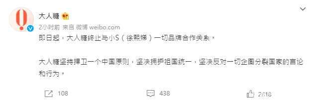 ▼「大人糖」宣布停止和小S的合作。(图/翻摄自大人糖微博)