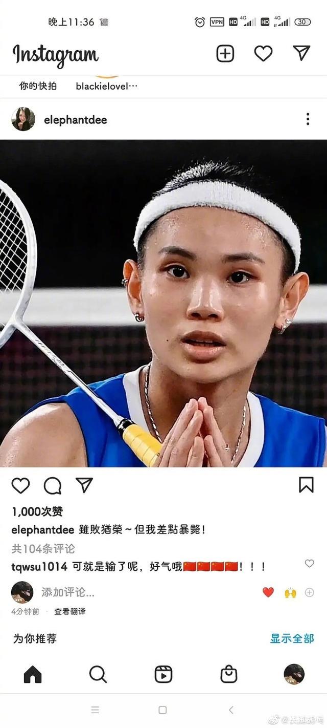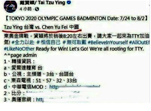 再回头看看这个失败的戴资颖,赛后在INS上发表了失败感言,内容中明确表示:TW是一个国家。