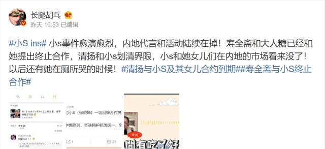 继清扬品牌言宣布与小S及其女儿划清界限之后,寿全斋、JORYA、大人糖等多个品牌宣布与小S解约,不但这些品牌的代言费没有拿到,还要面临巨额的违约赔偿金。