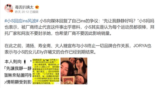 面对这一切,小S老妈赶紧出来卖惨,声称自己与女婿许雅钧已经大骂小S,女儿此时心情无法描述,十分沮丧,掉代言更是意料之外。