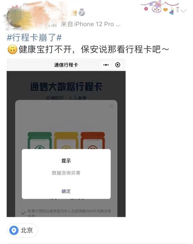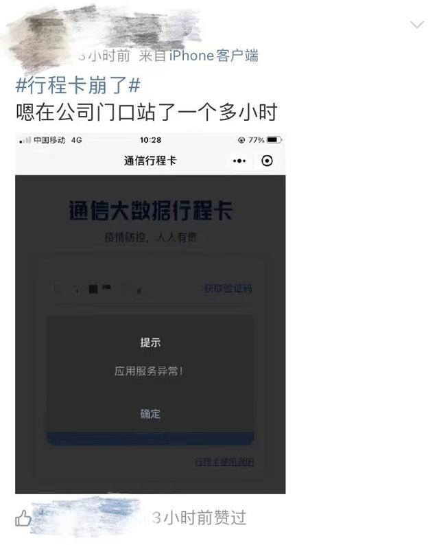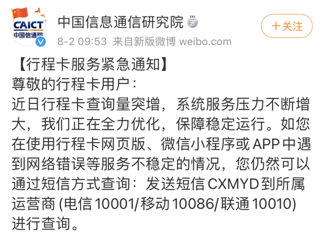 对此,昨天@中国信息通信研究院 在微博上回应称,因近日行程卡查询量突增,系统服务压力不断增大,如出现不稳定现象可发送短信进行查询。