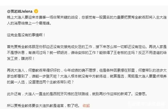 不过近些时间,有关贾秀全已经与足协完成解约的新闻非常多。女足随队记者王芳曾指出,中超俱乐部大连人已经向贾秀全指导发出邀约,希望他能够担任俱乐部中方教练组一职,以帮助外教何塞能够共同完成保级大任。由于贾秀全在执教女足期间,就已经在兼任大连人俱乐部青训总监,因此这一说法的可信度是非常高的。