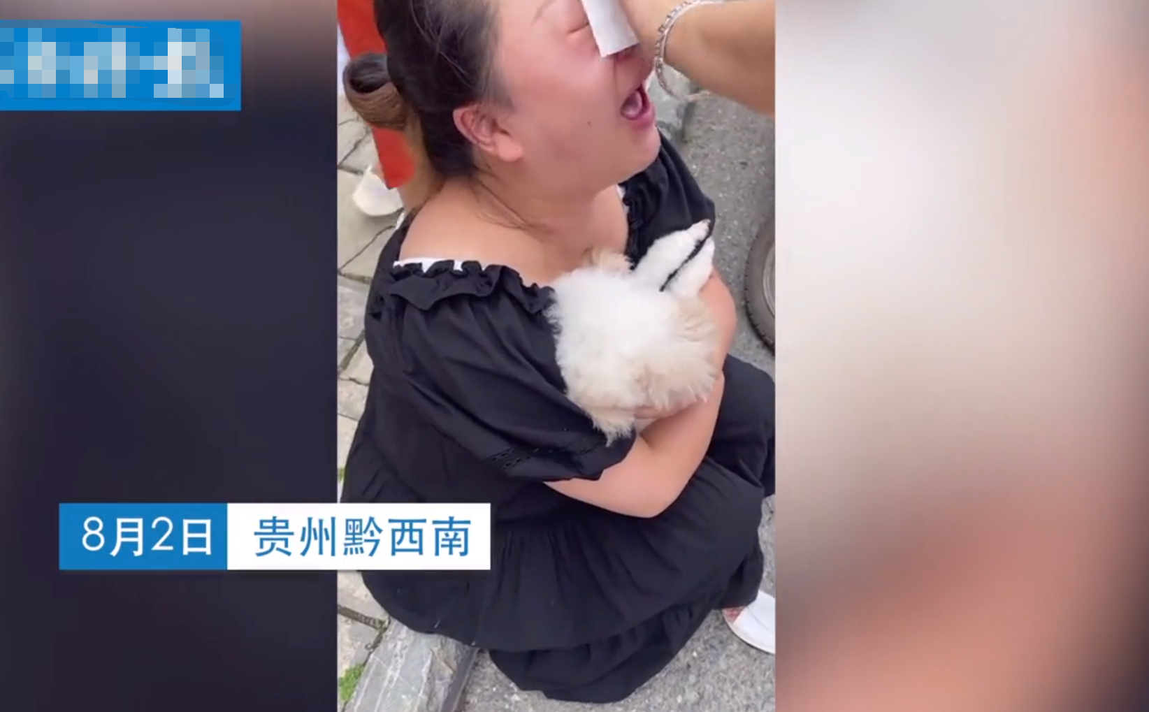 一位女性狗主人怀抱一只白色小狗,坐在路边哭得上气不接下气,宠物狗是很多人心灵的慰藉,也是家庭的一份子,就这样无故被人毒杀,是很多狗主人都接受不了的。