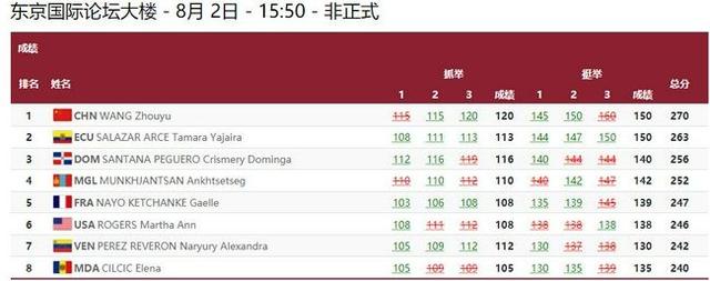 接下来的挺举比赛,汪周雨145公斤开把成功,二把成功举起150公斤,从而以总成绩270公斤锁定金牌。