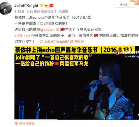 影片显示,蔡依林在2016年8月13日的上海echo回声嘉年华音乐节上说,「我唱这首歌顺便送给我一个铁粉,他最近获得了奥运金牌,就是马龙,他超厉害对不对,因为我最近每天都早睡早起,为了要看奥运,在看到自己熟悉的朋友得奖的时候,我觉得好开心喔。」