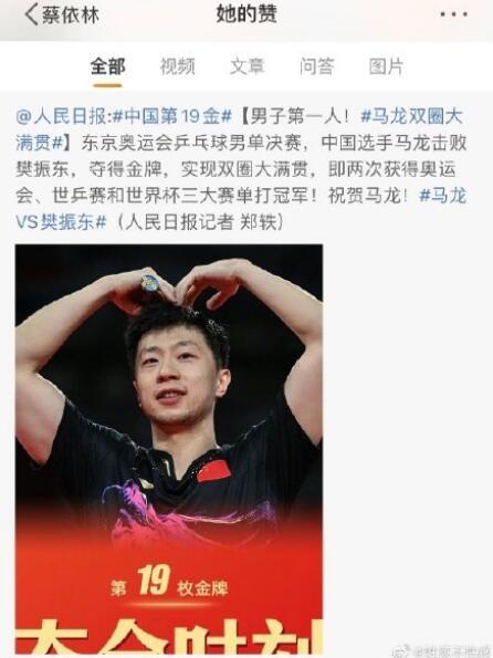 据悉,7月30日,奥运会桌球男子单打决赛落下帷幕,最终中国选手马龙4比2击败队友樊振东,卫冕奥运会男单金牌。至此,这位32岁的老将成为首位在奥运会上蝉联男单冠军的人,同时,他还创下了连续三届奥运会连获4金的壮举。而此前,他早已完成了包揽奥运会、世锦赛、亚运会、亚锦赛、亚洲杯、大奖赛总决赛、全运会的男单冠军。