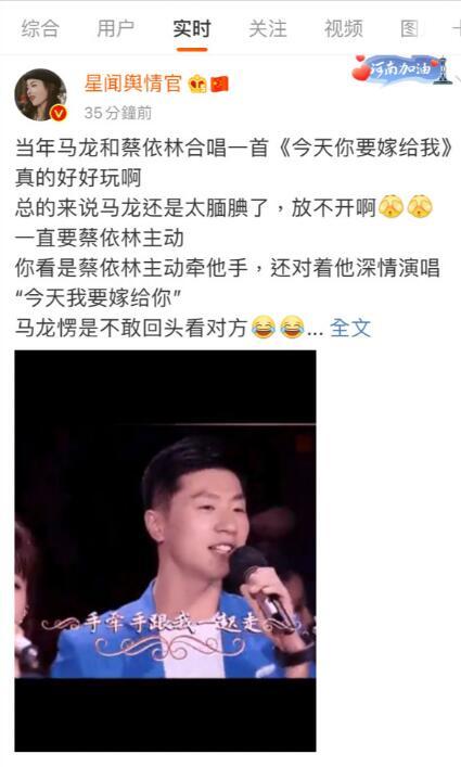随后,还有网友PO出,蔡依林曾参加大陆综艺节目《天天向上》时,和马龙合唱了一首《今天妳要嫁给我》。此外,不断有人在评论区翻出蔡依林曾为中国队加油的证据,比如,她曾在微博给马龙按讚,按讚中国女排,ins上图片说「Chinese Taipei」等等。