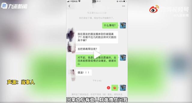 8月2日,广州一志愿者网传视频称自己因去郑州援助回来需要隔离被骂。据当事人介绍,当时与同事自费到郑州帮受灾市民解决车辆泡水问题,在返回途中郑州爆发疫情,得知自己需要隔离。之后有少数人对自己谩骂攻击,对此感到十分委屈。