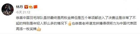 在东京奥运会羽毛球所有比赛落下帷幕之后,前男单领军人物林丹也在社交媒体上发挥称赞了东京奥运会中国羽毛球队的整体表现,林丹表示:“恭喜中国羽毛球队,虽然最终是两枚金牌,但五个单项都进入决赛,这是非常了不起的,特别是年轻人那么多的情况下。也恭喜老将谌龙,拼搏得很努力,为中国代表团再添一枚奖牌。