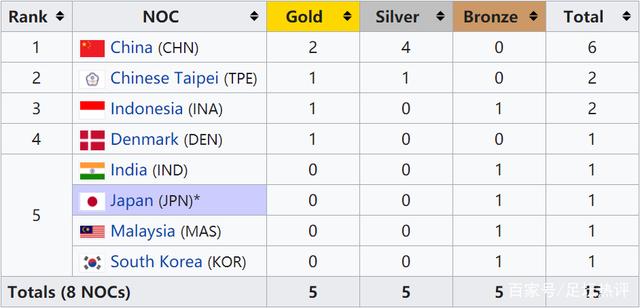 五项比赛,中国队收获2金4银,中国台北1金1银,印尼1金1铜,丹麦1金,印度、马来西亚、日本、韩国各1铜。