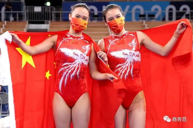 比如蹦床选手的赛服,就着实惊艳了不少人。同样来自安踏,整体是旗袍+中国红的设计,在中央点缀了一个昂首向上的白色凤凰,给人一种蓬勃的生命力,再加上各种blingbling的水钻做装饰,就像旋转的精灵~