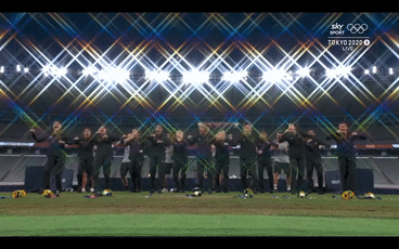 新西兰队这次的队服来自匹克,基本上就是黑衣配logo,设计极简到家了。队员们的表情也很严肃,黑口罩+一身黑,气氛莫名肃穆起来。