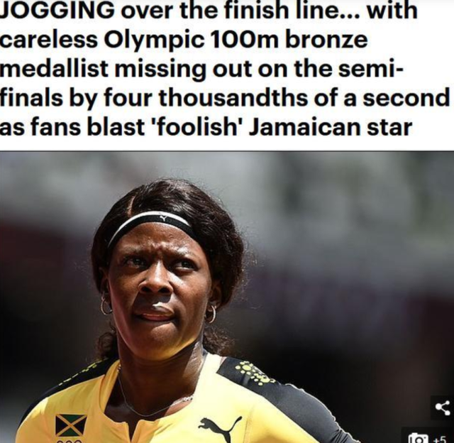 要知道,当时,她以千分之四秒的差距排名第四惨遭淘汰。结果,她的奇葩操作也是被牙买加的粉丝们所嘲讽,在社交媒体上,他们嘲讽牙买加女飞人简直是“奥运史上第一大蠢蛋”!
