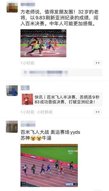 在随后进行的决赛中,尽管苏炳添的成绩没有半决赛好,但朋友圈的祝福和点赞依然没有停。