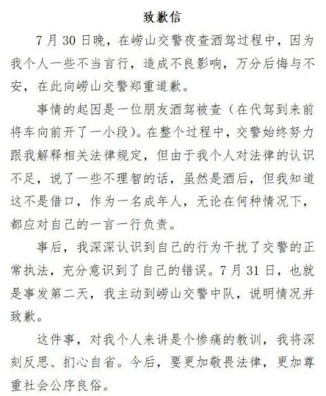 2021年7月30日是第31届青岛国际啤酒节开幕,当晚交警依法检查酒驾,还在某平台的官方账号直播执法过程。在直播过程中,该醉酒男子意识到自己在被拍摄后,称自己是老师并且让拍摄人员与自己保持安全距离,并且开始了自己的“演讲会”。根据该男子的衣着标签显示他为某数据分析培训机构的工作人员。8月1日,该名男子在某平台发布了一封致歉信,表示自己已于7月31日亲自向警方致歉,并将在未来的日子里深刻反省自己的行为。平台信息显示其为加拿大约克大学特聘教授,数据营销实战专家。