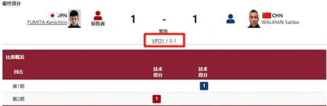 双方在比赛中因技术得分各得一分,最后裁判评分给日本选手加了2分,日本选手以3-1取胜。