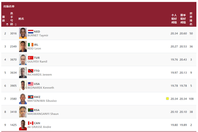 谢震业和美国奈顿、尼日利亚奥杜杜鲁、卡塔尔奥古诺德、牙买加德怀尔同组,17岁奈顿是00后天才级黑马,今年以19秒88和19秒84两破博尔特青年世界纪录,硬实力在20秒内,正常发挥有望轻松拿下小组第一。