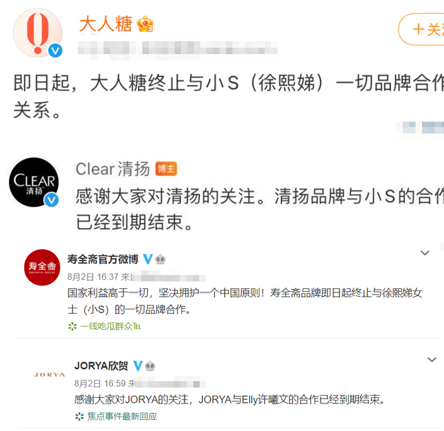 从大人糖到亲眼,从寿全斋到欣贺,四大品牌都在第一时间就做出了决定,相继发文跟小S解约,速度也不过才几个小时而已,可见,当下的品牌的立场还是比较明确的。