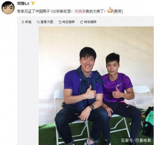 当时还没跌下神坛的刘翔,当场跟苏炳添拍了合影。
