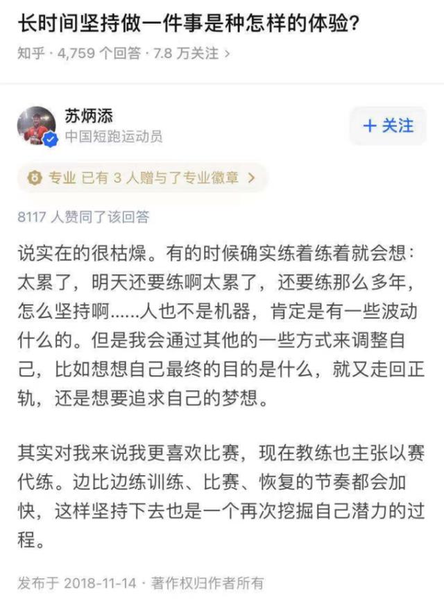 总之,苏炳添吃的苦、受的罪、低调的拼搏,明显比成绩本身更值得称赞。