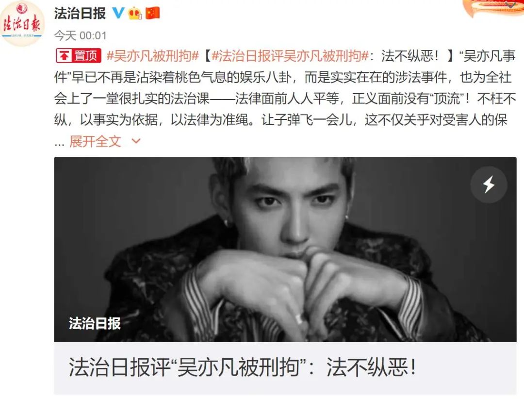 法治日报再评“吴亦凡被刑拘”: