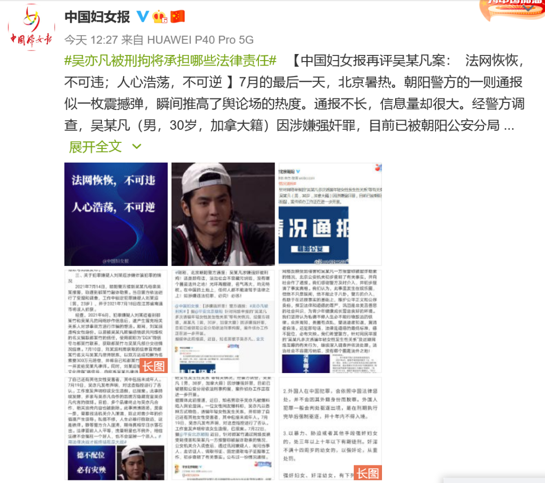 中国妇女报 不管哪个圈,是不是顶流,有没有后台,任何人都没有凌驾于法律之上的特权。违法必究,更是铁律。 法律面前人人平等是这个国家的法治精神,公平正义是这个国家的核心价值,维护妇女合法权益是这个国家的国家意志,明大德守公德修私德是这个国家的道徳要求。 法网恢恢,不可违;人心浩荡,不可逆。任何人,不管如何“顶流”,任何行业,不管如何"贵圈",守法才能行稳,遵德才能致远。