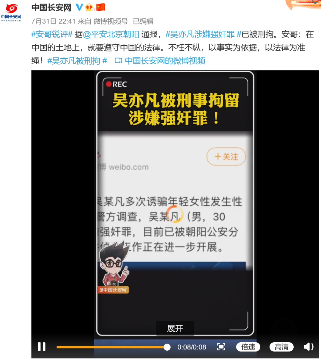 【摘要】 7月31日晚,北京市公安局朝阳分局官方微博发布,针对网络举报的“吴某凡多次诱骗年轻女性发生性关系”等有关情况,经警方调查,吴某凡