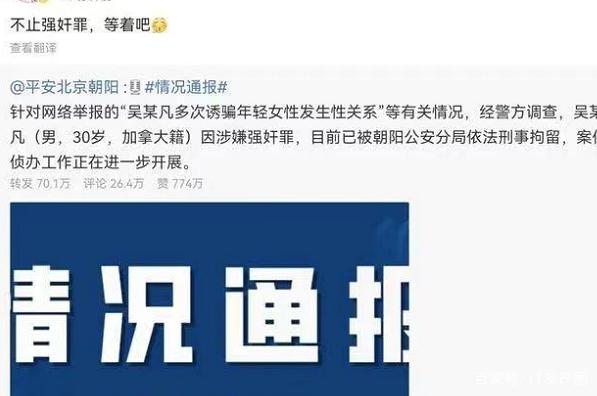 7月31日,北京警方发布消息,吴亦凡因涉嫌强奸罪,已被依法刑事拘留。