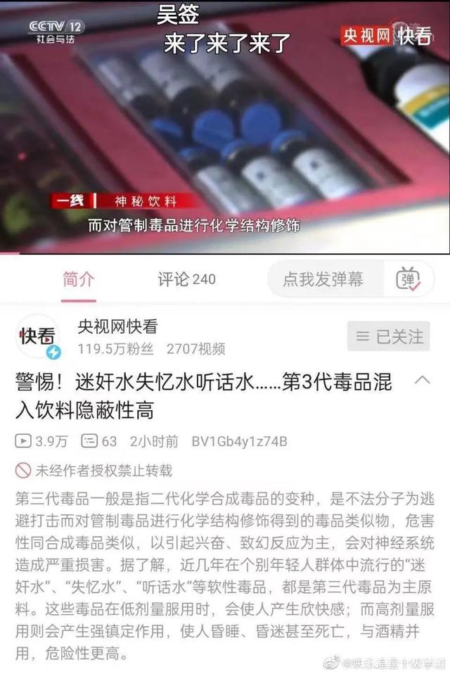 中国禁毒昨天发布吴亦凡的推文。央视网今天上传的视频科普:“警惕mj水失忆水听话水……”