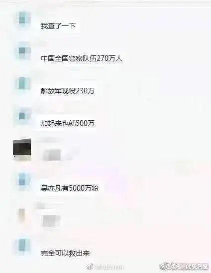 脑残重症粉丝群中有人说“吴亦凡有5000万粉丝,解放军和警察队伍加起来也就500万,完全可以救出来”的。