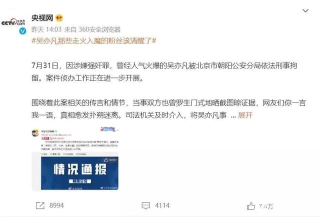 央视也在昨天发微博称:吴亦凡的那些走火入魔的粉丝该醒醒了。