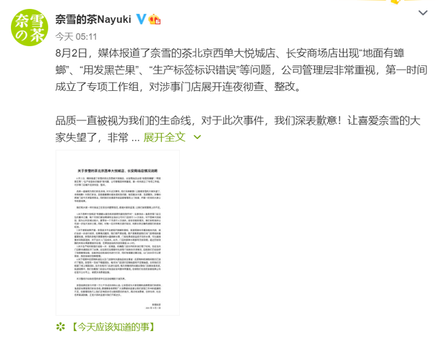 8月3日,奈雪的茶通过官方微博发布情况说明称,就媒体报道的问题,公司管理层非常重视,第一时间成立了专项工作组,对涉事门店展开连夜彻查、整改。对于此次事件,深表歉意!让喜爱奈雪的大家失望了,非常抱歉!涉事的两家门店今天将暂停营业,同时我们会邀请市场监督管理局上门检查,并第一时间向大家公布检查结果。