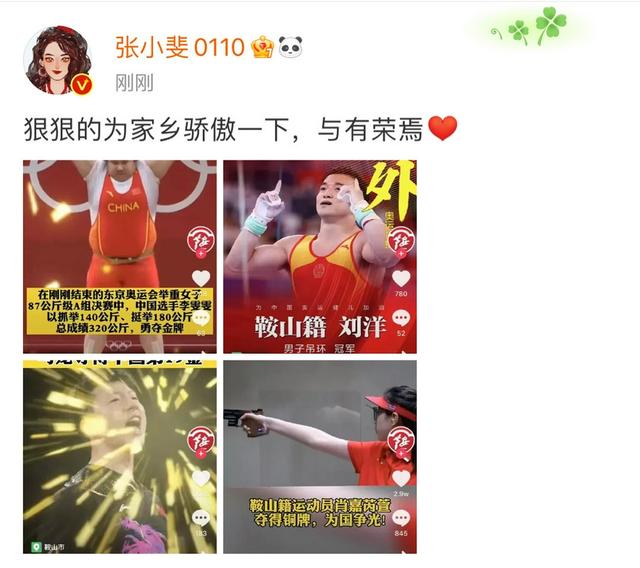 新浪娱乐讯 8月3日,张小斐晒出举重冠军李雯雯、吊环冠军刘洋、乒乓球男单卫冕冠军马龙以及25米手枪季军肖嘉睿萱在奥运会中的精彩瞬间,为他们打call。据悉,这四位运动员都和张小斐一样来自辽宁鞍山,张小斐给老乡加油的同时还表示:“狠狠的为家乡骄傲一下,与有荣焉。”