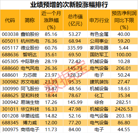 就行业来看,在机械设备行业继续保持涨势的次新股中,共有16只,其中盛剑环境近一个月累计上涨111.24%居首位。电器、电子行业紧随其后,分别有13股、12股上涨。表现方面,目前共有28只次新股公布上半年业绩预告或中报,26家净利润预增,华立科技、信安世纪、易瑞生物等8股预计净利润增幅在100%以上。